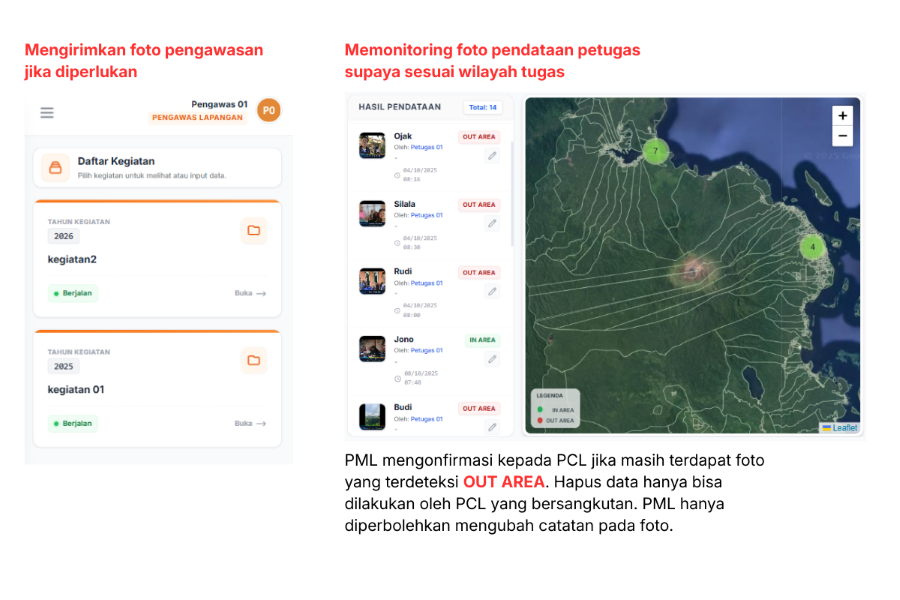 Sistem memetakan batas desa secara digital. Jika petugas mengambil foto di luar radius toleransi, sistem memberikan peringatan dini seketika.